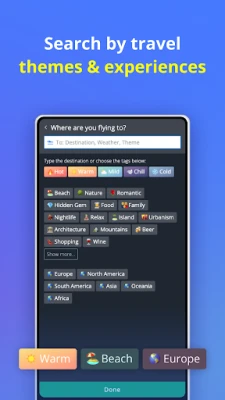 Instead of picking a specific city or airport you can specify a country, continent, or even anywhere and get flights+hotels in one search. Want to get some inspiration for your vacation? Choose themes like “beach” or “warm destinations”.
