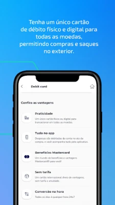 • Cartão de débito global, disponível tanto em formato físico quanto digital, para compras online e presenciais.