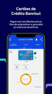 • Cartões de Crédito Banrisul: Faça a gestão de seus cartões de crédito, com diversos serviços que vão facilitar seu dia-a-dia. Consulte limites, faturas e melhor dia de compra, registre o uso do cartão no exterior, peça uma nova via, desbloqueie o cartão novo que chegou, gere um Cartão de Crédito Virtual e faça transações online com muito mais segurança. Tudo isso e muito mais, disponível para todos os nossos clientes.