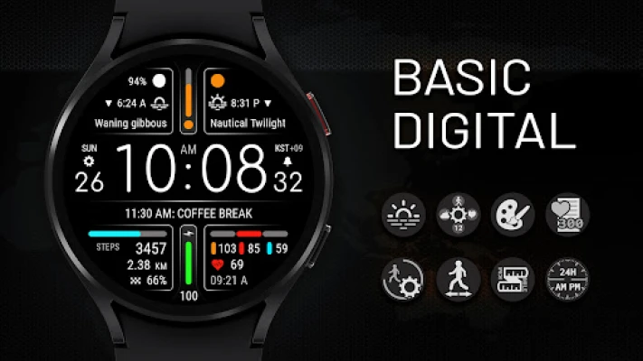 The watch face shows digital time, date, battery level, sunrise or sunset time, name of the current time of day, moon phase, moon illumination percentage, moonrise or moonset time, steps and distance traveled, heart rate and history of heart rate measurement.
