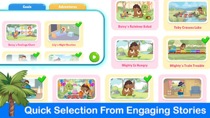 Story-based learning journeys where kids complete activities in fun scenarios with friendly characters like Mighty the Mammoth, Toby the T-Rex, and Daisy the Dodo.