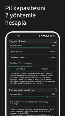 Pilinizin ne kadar süre dayanacağını öğrenmek ister misiniz? Battery One’ın deneysel aşınma tahmin özelliği, kullanım stilinize göre pil ömrünüzü tahmin eder. Bu görevi yerine getirmek için gelişmiş bir algoritma kullanılır ve size pilinizin gelecekteki performansı hakkında bilgi verir.