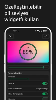 - Mevcut pil seviyesini gösteren, renk ve metin boyutu özelleştirilebilen widget.