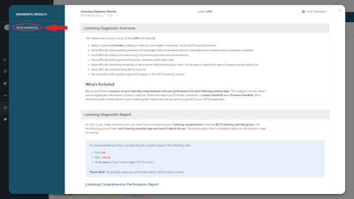 2) After completing the test, view the DIAGNOSTIC RESULTS. To view them, CLICK View Results button FOUND under each section. The results provide you with a detailed analysis on your performance, some useful tips and strategies for improving your weaker areas, a checklist of questions and lessons to complete, and an estimate of how long you should study to achieve your goal.