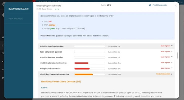 3) Based on the DIAGNOSTIC RESULTS, use our IELTS LESSONS to learn the needed tips and strategies and use TEST/STUDY Mode section to hone your skills.