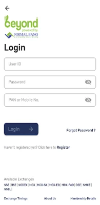 Beyond 2.0 is Nirmal Bang's official stock trading mobile application. The Beyond-Pro app enables clients to connect to the stock markets to track and trade in Indian Equity, Derivatives, Commodities and Currency markets. Beyond-Pro simplifies your share market experience by streamlining all trading activities; making buying, selling and everything in between as simple as clicking a few buttons. With the Beyond app, you can keep a watch on multiple markets, trade on the go, get reports as and when you need and securely transfer and withdraw funds instantly.