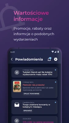 Twój ulubiony wykonawca właśnie ogłosił tournée po Polsce i chcesz wiedzieć jako pierwszy, że bilety będą dostępne? Nie możesz doczekać się występu ulubionego stand-upera? Z pomocą aplikacji Biletyna zawsze będziesz na bieżąco z najnowszymi wydarzeniami, na których zależy Ci najbardziej. Prosty system powiadomień poinformuje Cię, kiedy rozpocznie się sprzedaż biletów lub zapowie kolejny występ Twojego ulubionego artysty czy zespołu.