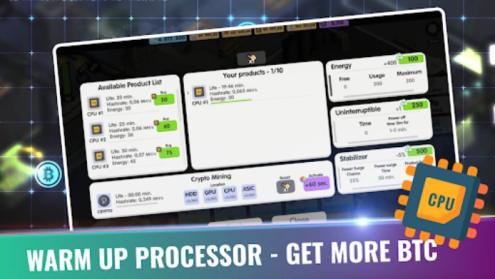 Hire and upgrade factory parts to speed up your process, earn idle cash, upgrade your rigs and mine in this simulation video game! Click and tap, then tap some more and start your BTC adventure!