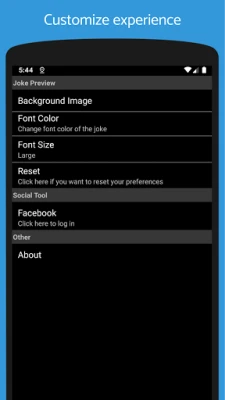 - Jokes in different categories - Simple design to help you navigate jokes - Customize your experience: changing background, font color, font size - Share jokes with friends - Save jokes to your favorite - Search jokes by a keyword