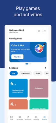 • A large library of Lessons on various topics, from traveling to phone calls to computer technology.