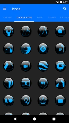 3.Select the icon, this will show your icon packs, select Blue Glass and choose your icon, Built-in Search Feature within the App.
