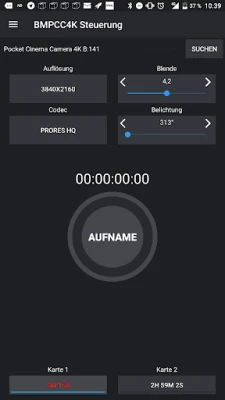 - Zeigt dabei den laufenden Timecode, verbleibenden Speicher und wichtige Parameter an.