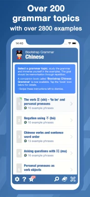 THE COMPANION BOOK: The companion book is available called "BootStrap Chinese Grammar". The book includes all the content contained in this app - including 185 grammar topics and over 3200 example phrases. -- Just search for "BootStrap Chinese Grammar" on Amazon.