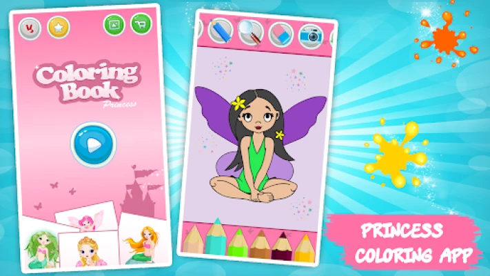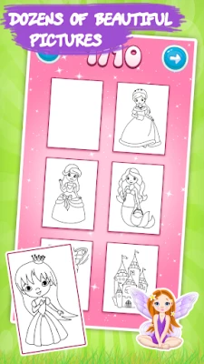 - Çocuk boyama kitabı, kızlar için 50'den fazla boyama sayfası içerir, bazıları Sindirella, Küçük kırmızı başlıklı kız, Uyuyan güzel, Pamuk Prenses ve hatta Rumpelstiltskin gibi ünlü masallardandır.