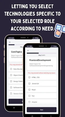 Focus your prep by selecting from 100+ tools and frameworks including React, Angular, Spring Boot, Node.js, SQL, Python, Django, AWS, GCP, Kubernetes, and many more.