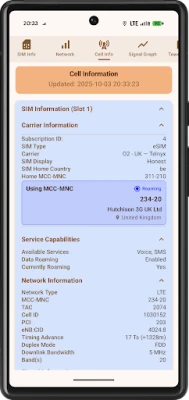 Carrier Details: Instantly see MCC, MNC, LAC/TAC, and the specific Cell ID you are connected to.