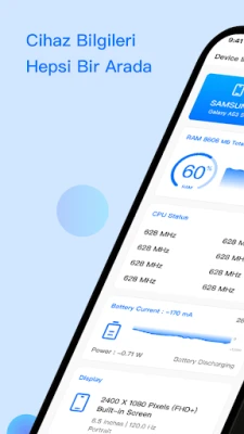 Cihazın CPU, GPU, RAM, işletim sistemi, sensörler, depolama alanı, pil, Wi-Fi, Bluetooth, ağ, uygulamalar, ekran, kamera ve termal performansı hakkında gerçek zamanlı verileri izler.