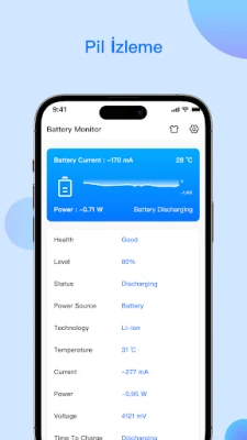 👉 Pil Bilgileri: Pilinizin sağlığını, seviyesini, durumunu, teknolojisini, sıcaklığını, voltajını, gücünü (watt), akımını (mA) ve kapasitesini gerçek zamanlı olarak izleyin.