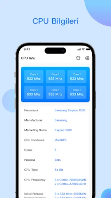 👉 CPU Bilgileri: Çip Üzerindeki Sistem, İşlemciler, CPU Mimarisi, Desteklenen ABI'ler, CPU Donanımı, CPU Düzenleyicisi, Çekirdek Sayısı, CPU Frekansı, GPU İşleyicisi, GPU Üreticisi ve GPU Sürümü hakkında tüm ayrıntıları görüntüleyin.