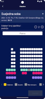 Kupovina ulaznica: osiguraj svoja mjesta u samo nekoliko klikova – biraj sjedište, film i vrijeme projekcije, a sve to direktno iz aplikacije.