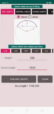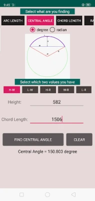 2) Arc Calculator: In this calculator you can find arc length, central angle, chord length, radius, height, sector area, segment area. All you have to do is to put two known values.