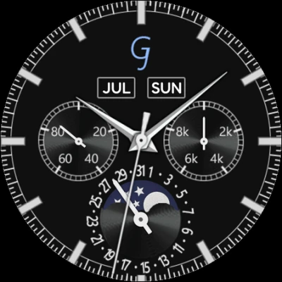 A watch face designed for Wear OS that shows local time, battery percentage, and step count.
