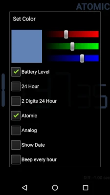 * Resizable Widget. * Show Date option. * Atomic sync with NIST Internet Time Server (see http://www.time.gov/), to give you the most accurate time. * Accurate battery level. (Hidden when reached 100%). * Select any colors using red / green / blue sliders. * 12 / 24 hour.
