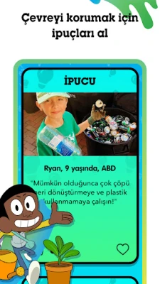Cartoon Network İklim Koruyucuları uygulaması günlük görevler, tüyolar, eğlenceli bilgiler, videolar, testler ve anketler gibi harika içeriklerle dolu! Eğlence bununla bitmiyor; dünyanın her yerinden çocukların fark yaratmak ve gezegenimize iyi bakmak için neler yaptığını da keşfedebilirsin. Küçük değişiklikler yaparsak bir arada BÜYÜK fark yaratabiliriz- İklim Koruyucularının olayı bu!