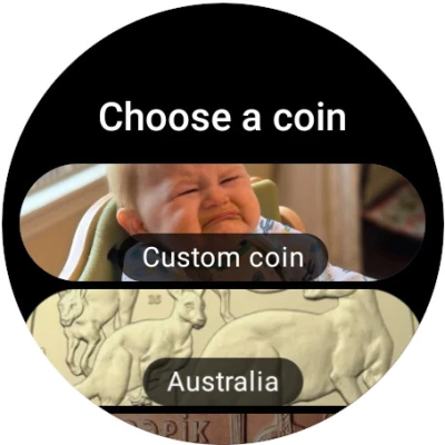 Create custom coins or select from one of the many coins from different countries. Custom coins can be sent from the mobile app to your Wear OS device!