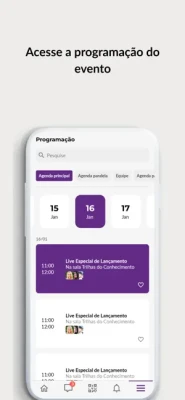Com o aplicativo “CONECtados 2023”, você tem acesso a uma rede social exclusiva, pode fazer novos contatos, enviar perguntas aos palestrantes, trocar mensagens com outros participantes, enfim, interagir com a comunidade. Além disso, você pode consultar a programação, avaliar conteúdos, dar feedback e responder quizzes. Utilize o APP e aproveite ao máximo os recursos.