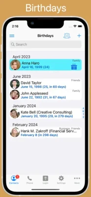 The search function enables you to search for different information within all your contacts on your device. There is also a function to list all birthdays.