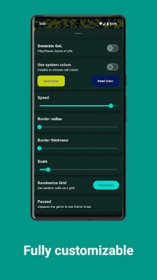 It features modern Material You design that adapts to your system theme and changes with it. You can configure cells of the Game to your liking by setting up their roundness, border width and color. Setting up speed of the animation and overall scaling of the grid is also helpful to observe the Game itself, with it's endless complexity and beauty.