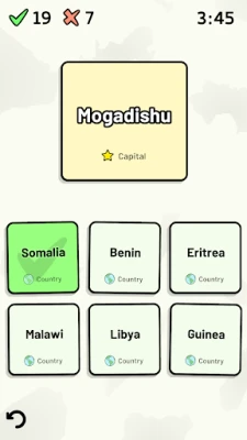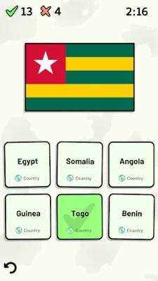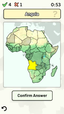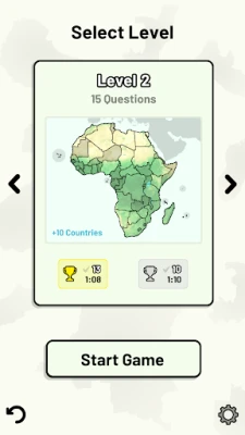 Customizable quizzes allow you to choose which African countries to test, as well as the topic. Past results for each African country are displayed to highlight your progress at each topic. Standard quizzes allow you to learn each topic by progressing through a series of levels, each covering additional countries.