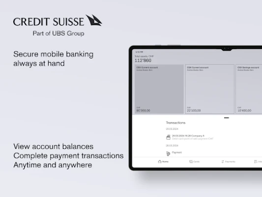 Whether at home or on the way: As a client of Credit Suisse – you can take care of your banking business whenever you like. Save time and money by making payments and securities transactions via Mobile Banking and enjoy convenient, flexible banking – all protected by high security standards.