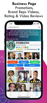 A business listing page that displays customer's video reviews about their experience with the service or product, in return customers would receive promotional offers and discounts.