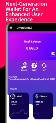 CryptoMineX is the ultimate cloud mining app that enables users to mine EGLD effortlessly. With a user-friendly interface and intuitive design, CryptoMineX provides an unparalleled mining experience that is accessible to everyone. This app is designed to give users a chance to simulate cloud mining on their mobile devices and learn more about the process of mining cryptocurrencies.