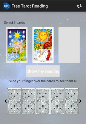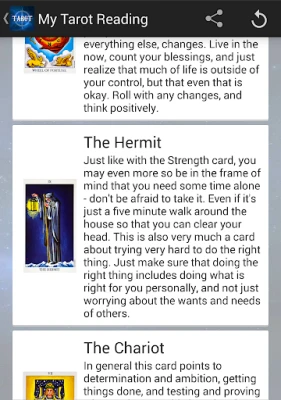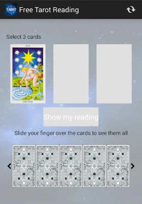 App features: * Throw the cards simple and fast. This is an application very easy to use and anyone will be able to handle it with no problems at all. * Full App: You will be able to know the prediction of your professional future, job as well as in the love tarot. * Don´t worry if you don’t know what a card says, we will take care of the reading and the meaning. Tarot is related to astrology, chart and horoscope and that´s the reason why it is hard to understand the cards and their meanings. That´s why we created this app that will let you the power that these cards have. * If you like to play the cards, you will enjoy playing the “Tarot of the day” many times you want and totally free.