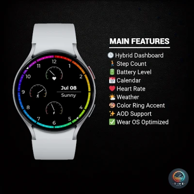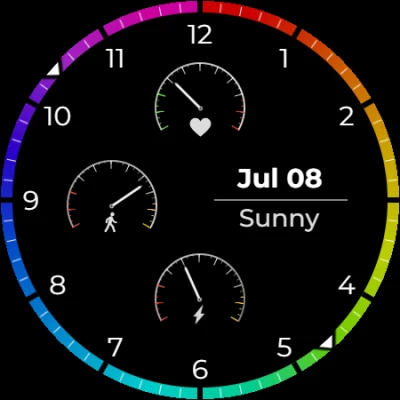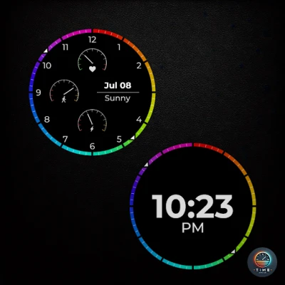 Dash Drive, ihtiyaç duyduğunuz temel bilgileri — adımlar, kalp atış hızı, pil, tarih ve hava durumu — temiz, modern bir gösterge paneli düzeninde sunan hibrit tarzda bir saat kadranıdır. Renkli dış halka, klasik düzene canlı bir enerji katarken, gün boyunca ilerlemenize odaklanmanıza yardımcı olur.