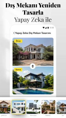AI destekli tasarım araçlarıyla evinizin dış cephesini ve bahçesini dönüştürün, hayalinizdeki alanı görselleştirin. Evinizin dış tasarımı için birçok yenilikçi fikirle sınırlamalara veda edin. Sadece evinizin fotoğrafını yükleyin, tercih ettiğiniz tarzı seçin, AI size kişiselleştirilmiş bir tasarım planı sunacaktır.