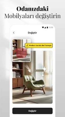 Kusursuz Değişimle Sınırsız Yaratıcılık - Mevcut mobilyalarınızdan veya dekorasyonunuzdan sıkıldınız mı? "Değiştir" özelliği ile istemediğiniz öğeleri silip yerine görmek istediklerinizi ekleyebilir, evinize yeni bir hayat veren görseller oluşturabilirsiniz.