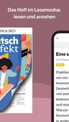 Einfach besser Deutsch lesen, hören, üben – mit der Deutsch-perfekt-App. Im eMagazine finden Sie alle Inhalte von Deutsch perfekt auf Ihrem Bildschirm. Lesen und hören Sie jeden Monat Neues über Gesellschaft, Politik und das Leben in Deutschland, Österreich und der Schweiz – in einfachem Deutsch auf verschiedenen Sprachstufen ab A2. Darüber hinaus finden Sie in der App den Audiotrainer und das Übungsheft von Deutsch perfekt.