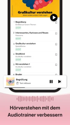 Entdecken Sie 60 Minuten Hörtraining pro Monat. Lernen, üben und hören Sie die deutsche Sprache, während Sie etwas anderes machen: im Auto, unterwegs, beim Kochen oder beim Sport. Hören Sie professionellen Sprecherinnen und Sprechern zu, und verbessern Sie Ihren Wortschatz. Gleichzeitig trainieren Sie Ihre Aussprache.