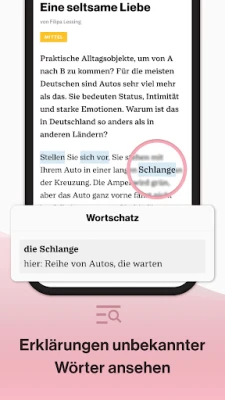 Die Deutsch-perfekt-App unterstützt Sie beim Deutschlernen und bietet Ihnen eine intuitve Benutzerführung in der Verbindung von Text, Audioinhalten und Übungen. Durch das Anpassen der Schriftgröße ist gute Lesbarkeit auch auf kleinen Bildschirmen gegeben. Das Nachschlagen von unbekannten Worten direkt im Text ermöglicht ihn ein gutes Leseverständnis trotz unbekanntem Vokabular.
