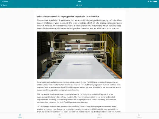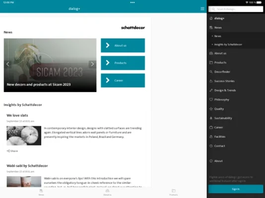 This is where users can find the latest news and stories from the world of Schattdecor. The app contains all important information on products, trade shows, events and company news.