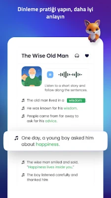 Okuma alışkanlığını dil öğrenme yolculuğuna dönüştür! Seviyene uygun hikâyelerle kelime dağarcığını geliştir ve cümle yapılarını doğal bir şekilde kavra. Bilmediğin kelimelere dokunarak anında çevirilerini görebilir ve doğru telaffuzlarını dinleyebilirsin. Hem eğlenceli hem de sürükleyici bir okuma deneyimiyle dil becerilerini geliştir!