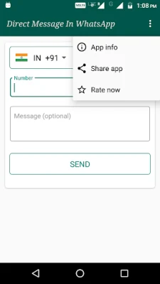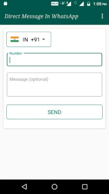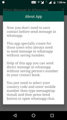 This app specially create for those who always need to send message in whatsapp without saving number. Help of this app you can send direct message in whatsapp without saving person's number in your contact book. You just need to select your country code and enter mobile number then type message(optional) and then press Send button to open whatsapp chat.