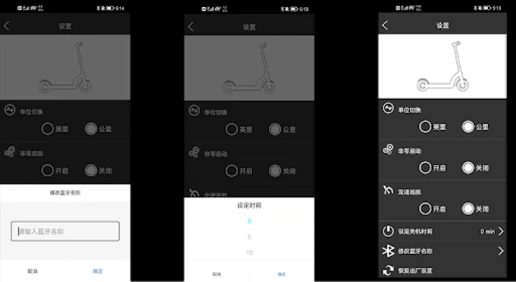 The APP reads the scooter's mileage, current power, speed, controls the scooter's power on and off, headlights, gears, and on the settings page features: Mileage Unit Switch, Non Zero Start Switch, cruise function switch, timer off time settings.