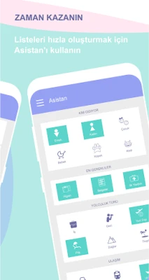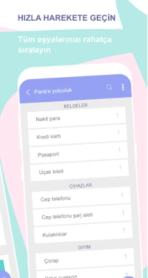Yapılacaklar ve Alışveriş listeleri. Alınacak öğelerin yanı sıra, Easy Pack ayrıca yolculuktaki işlerinizi yerine getirmenize yardımcı olacak yapılacaklar ve alışveriş listeleri de içerir.