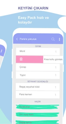 Easy Pack yolculuk, konaklama ve günlük aktiviteleriniz için kullanabileceğiniz ücretsiz bir bavul hazırlama yardımcısıdır. İçeriğindeki yapılacaklar ve alınacak şeyler listeleri sayesinde, bir tatil ve alışveriş planlayıcısı olarak da kullanabilirsiniz. Uygulama hızlı, basit ve küçüktür (3 MB). Easy Pack’i kendi ihtiyaçlarınız için kolayca özelleştirebilirsiniz.