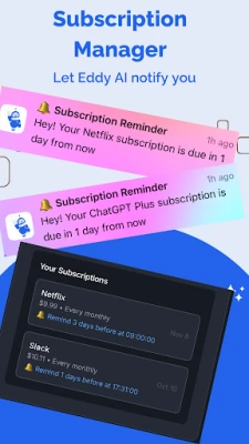 Add all your subscriptions at one place, let Eddy AI notify when before renewal so you never miss your payment. Do not pay for subscriptions which you don't need. Track & start saving now!